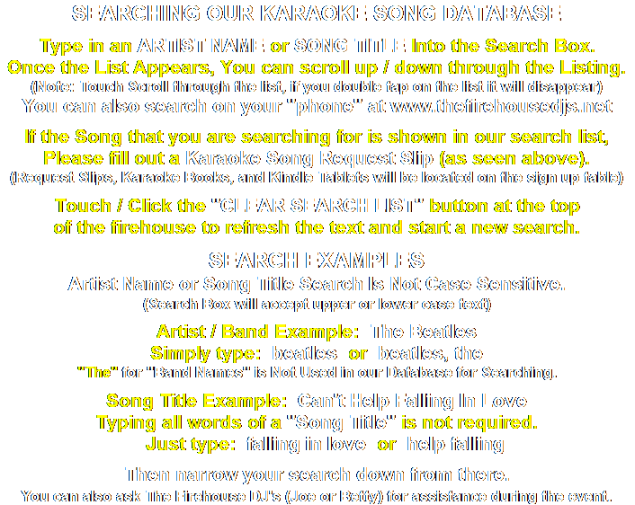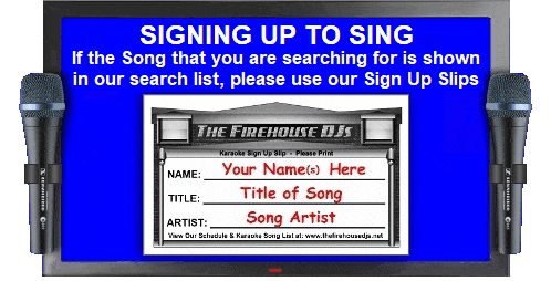 PHONE USERS: TOUCH / SCROLL Inside this Window PC USERS: Scroll Bar is to the RIGHT in this Window (Private Events are not always listed on our Schedule) KARAOKE SUNDAY, JANUARY 25 Sunday Funday Karaoke ! Location: CELLAR 75 LOUNGE (at The Barn Resort) Timeframe: 2:00 - 5:00 p.m. (Karaoke sign up starts at 1:30) Get there early, Lounge Area holds about 50 people. Go into Main Entrance, then go right and take the escalator down to the Cellar 75 Lounge. FOOD MENU AVAILABLE Address: 75 Cunningham Rd, Gettysburg, PA KARAOKE FRIDAY, FEBRUARY 6 Location: THURMONT AMVETS - Post 7 Timeframe: 7:00 - 10:00 p.m. (Karaoke sign up starts at 6:30) Must be signed in by an Amvets Member. Buzz in, let them know that We Can Sign You In. Kitchen Open until 7:00 p.m. (Last call for food from the Kitchen is at 6:45) Address: 26 Apples Church Rd, Thurmont, MD KARAOKE FRIDAY, FEBRUARY 13 Location: GETTYSBURG EAGLES - Aerie 1562 Timeframe: 7:00 - 10:00 p.m. (Karaoke sign up starts at 6:30) Must be signed in by a current Eagles Member. Buzz in, let them know that We Can Sign You In. Must show Drivers License as a Guest in PA. Kitchen Open until 8:00 p.m. (Last call for food from the Kitchen is at 7:45) NOTE: THIS IS A SMOKING VENUE Address: 61 N 5th Street, Gettysburg, PA KARAOKE SUNDAY, FEBRUARY 15 Sunday Funday Karaoke ! Location: CELLAR 75 LOUNGE (at The Barn Resort) Timeframe: 2:00 - 5:00 p.m. (Karaoke sign up starts at 1:30) Get there early, Lounge Area holds about 50 people. Go into Main Entrance, then go right and take the escalator down to the Cellar 75 Lounge. FOOD MENU AVAILABLE Address: 75 Cunningham Rd, Gettysburg, PA KARAOKE FRIDAY, FEBRUARY 20 Location: FAIRFIELD AMVETS - Post 172 Timeframe: 7:00 - 10:00 p.m. (Karaoke sign up starts at 6:30) - AMVETS Members and their guests only - Buzz in, let them know that We Can Sign You In. Kitchen Open until 8:30 p.m. Address: 3600 Fairfield Road, Fairfield, PA KARAOKE SATURDAY, MARCH 7 Location: THURMONT AMVETS - Post 7 Timeframe: 7:00 - 10:00 p.m. (Karaoke sign up starts at 6:30) Must be signed in by an Amvets Member. Buzz in, let them know that We Can Sign You In. Kitchen Open until 7:00 p.m. (Last call for food from the Kitchen is at 6:45) Address: 26 Apples Church Rd, Thurmont, MD KARAOKE FRIDAY, MARCH 13 Location: GETTYSBURG EAGLES - Aerie 1562 Timeframe: 7:00 - 10:00 p.m. (Karaoke sign up starts at 6:30) Must be signed in by a current Eagles Member. Buzz in, let them know that We Can Sign You In. Must show Drivers License as a Guest in PA. Kitchen Open until 8:00 p.m. (Last call for food from the Kitchen is at 7:45) NOTE: THIS IS A SMOKING VENUE Address: 61 N 5th Street, Gettysburg, PA KARAOKE SUNDAY, MARCH 29 Sunday Funday Karaoke ! Location: CELLAR 75 LOUNGE (at The Barn Resort) Timeframe: 2:00 - 5:00 p.m. (Karaoke sign up starts at 1:30) Get there early, Lounge Area holds about 50 people. Go into Main Entrance, then go right and take the escalator down to the Cellar 75 Lounge. FOOD MENU AVAILABLE Address: 75 Cunningham Rd, Gettysburg, PA KARAOKE SATURDAY, APRIL11 Location: THURMONT AMVETS - Post 7 Timeframe: 7:00 - 10:00 p.m. (Karaoke sign up starts at 6:30) Must be signed in by an Amvets Member. Buzz in, let them know that We Can Sign You In. Kitchen Open until 7:00 p.m. (Last call for food from the Kitchen is at 6:45) Address: 26 Apples Church Rd, Thurmont, MD KARAOKE FRIDAY, APRIL 17 Location: GETTYSBURG EAGLES - Aerie 1562 Timeframe: 7:00 - 10:00 p.m. (Karaoke sign up starts at 6:30) Must be signed in by a current Eagles Member. Buzz in, let them know that We Can Sign You In. Must show Drivers License as a Guest in PA. Kitchen Open until 8:00 p.m. (Last call for food from the Kitchen is at 7:45) NOTE: THIS IS A SMOKING VENUE Address: 61 N 5th Street, Gettysburg, PA KARAOKE SUNDAY, APRIL 26 Sunday Funday Karaoke ! Location: CELLAR 75 LOUNGE (at The Barn Resort) Timeframe: 2:00 - 5:00 p.m. (Karaoke sign up starts at 1:30) Get there early, Lounge Area holds about 50 people. Go into Main Entrance, then go right and take the escalator down to the Cellar 75 Lounge. FOOD MENU AVAILABLE Address: 75 Cunningham Rd, Gettysburg, PA KARAOKE FRIDAY, MAY 8 Location: GETTYSBURG EAGLES - Aerie 1562 Timeframe: 7:00 - 10:00 p.m. (Karaoke sign up starts at 6:30) Must be signed in by a current Eagles Member. Buzz in, let them know that We Can Sign You In. Must show Drivers License as a Guest in PA. Kitchen Open until 8:00 p.m. (Last call for food from the Kitchen is at 7:45) NOTE: THIS IS A SMOKING VENUE Address: 61 N 5th Street, Gettysburg, PA KARAOKE SATURDAY, MAY 23 Location: THURMONT AMVETS - Post 7 Timeframe: 7:00 - 10:00 p.m. (Karaoke sign up starts at 6:30) Must be signed in by an Amvets Member. Buzz in, let them know that We Can Sign You In. Kitchen Open until 7:00 p.m. (Last call for food from the Kitchen is at 6:45) Address: 26 Apples Church Rd, Thurmont, MD KARAOKE SUNDAY, MAY 17 Sunday Funday Karaoke ! Location: CELLAR 75 LOUNGE (at The Barn Resort) Timeframe: 2:00 - 5:00 p.m. (Karaoke sign up starts at 1:30) Get there early, Lounge Area holds about 50 people. Go into Main Entrance, then go right and take the escalator down to the Cellar 75 Lounge. FOOD MENU AVAILABLE Address: 75 Cunningham Rd, Gettysburg, PA KARAOKE SATURDAY, JUNE 6 Location: THURMONT AMVETS - Post 7 Timeframe: 7:00 - 10:00 p.m. (Karaoke sign up starts at 6:30) Must be signed in by an Amvets Member. Buzz in, let them know that We Can Sign You In. Kitchen Open until 7:00 p.m. (Last call for food from the Kitchen is at 6:45) Address: 26 Apples Church Rd, Thurmont, MD KARAOKE FRIDAY, JUNE 12 Location: GETTYSBURG EAGLES - Aerie 1562 Timeframe: 7:00 - 10:00 p.m. (Karaoke sign up starts at 6:30) Must be signed in by a current Eagles Member. Buzz in, let them know that We Can Sign You In. Must show Drivers License as a Guest in PA. Kitchen Open until 8:00 p.m. (Last call for food from the Kitchen is at 7:45) NOTE: THIS IS A SMOKING VENUE Address: 61 N 5th Street, Gettysburg, PA KARAOKE SUNDAY,